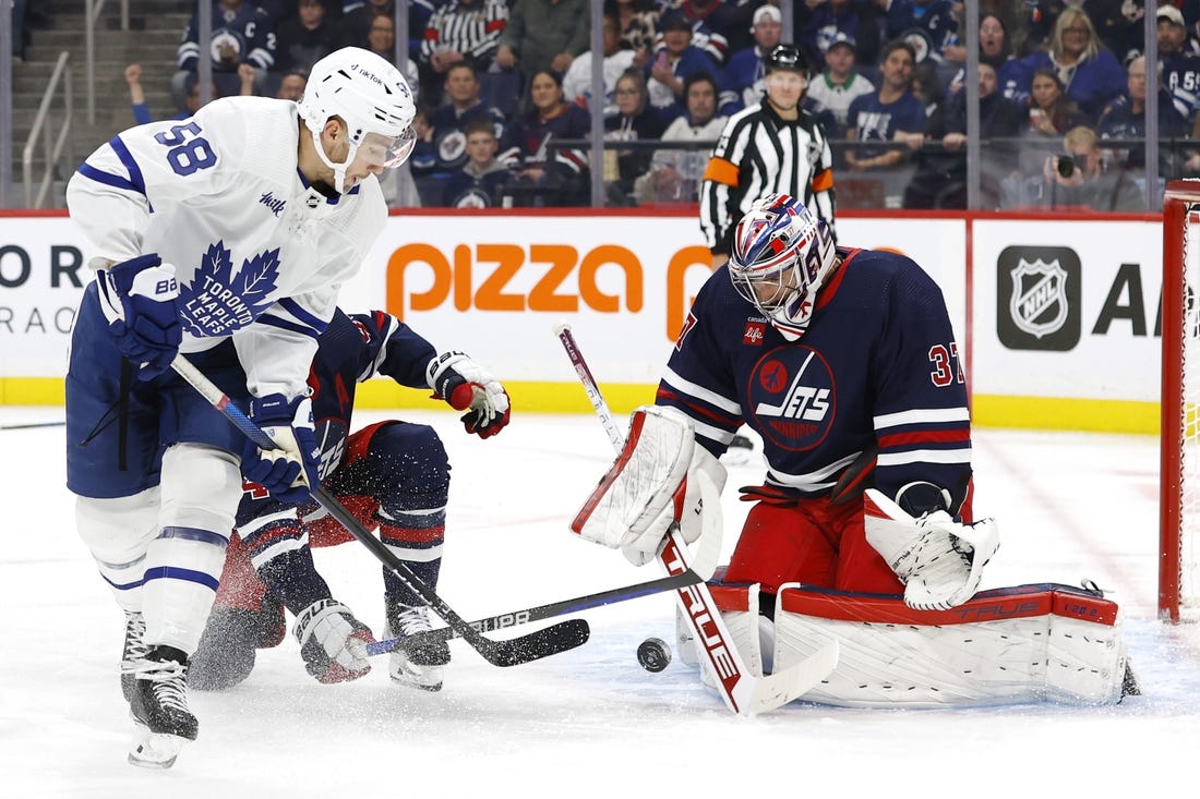 Hellebuyck twice stopped Matthews from close in at 10:14 of the second. Tavares hit the crossbar at 13:55.