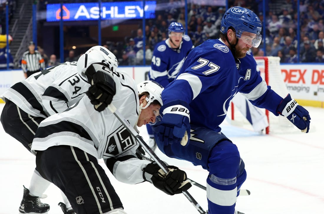 With Talbot on his back and the puck beneath him, Tampa Bay’s Anthony Cirelli worked his stick under the goalie’s pads and lifted in what appeared to be his ninth goal at 15:55.