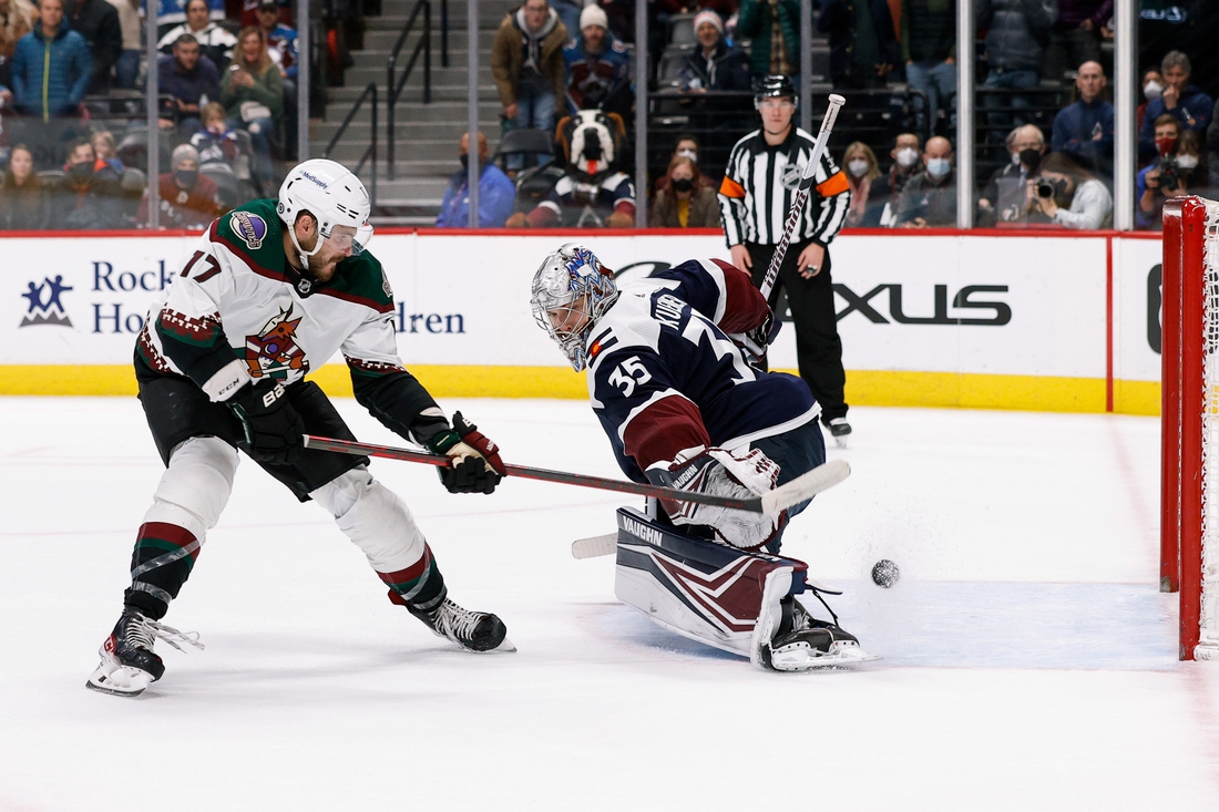 Colorado was poised to take the lead into the second intermission when the Coyotes struck. Arizona passed the puck around the Avalanche zone, and it went to Antoine Roussel in the left circle. He put a sharp angle snap shot on Francouz, who made a pad save.