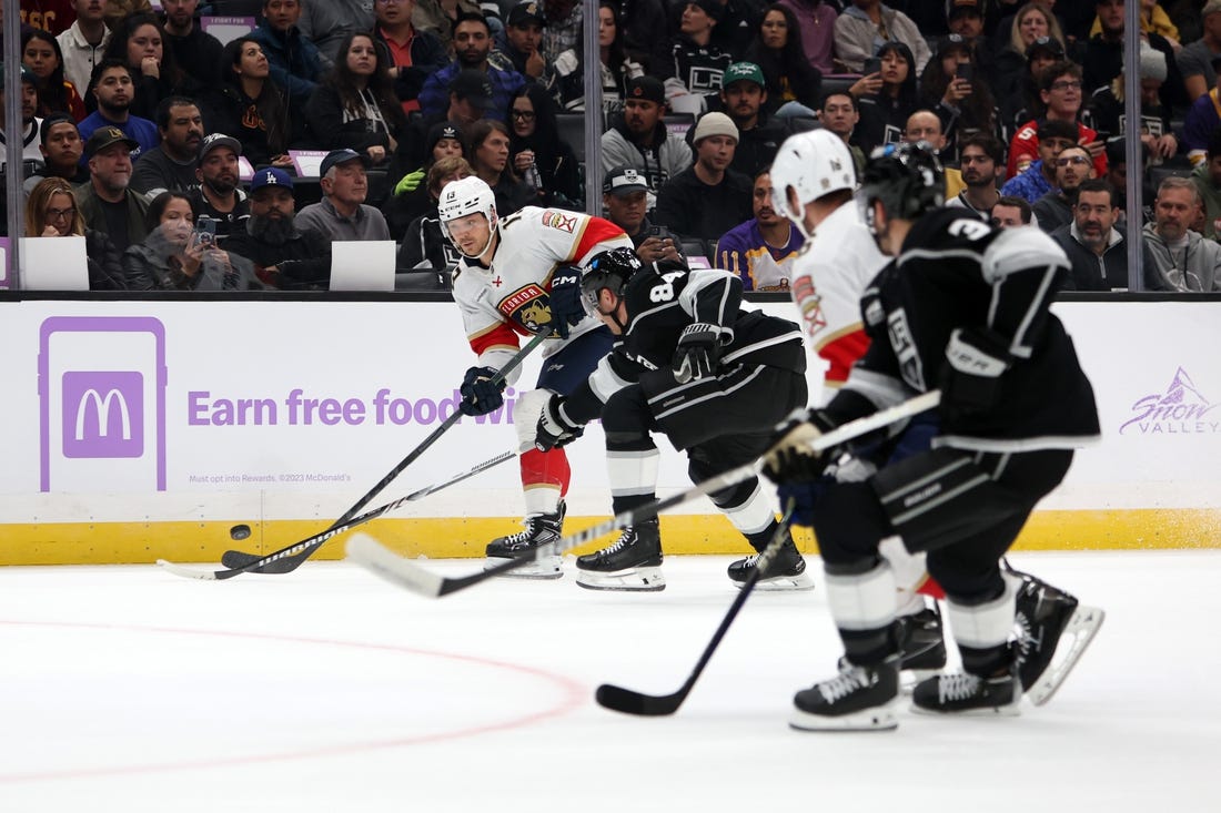 The Panthers failed to pinch a clearing attempt up the boards, leading to a two-on-one break by the Kings. Phillip Danault saucered a pass to Fiala on his left, and Fiala pulled the puck to his backhand before lifting it over Bobrovsky’s left pad.