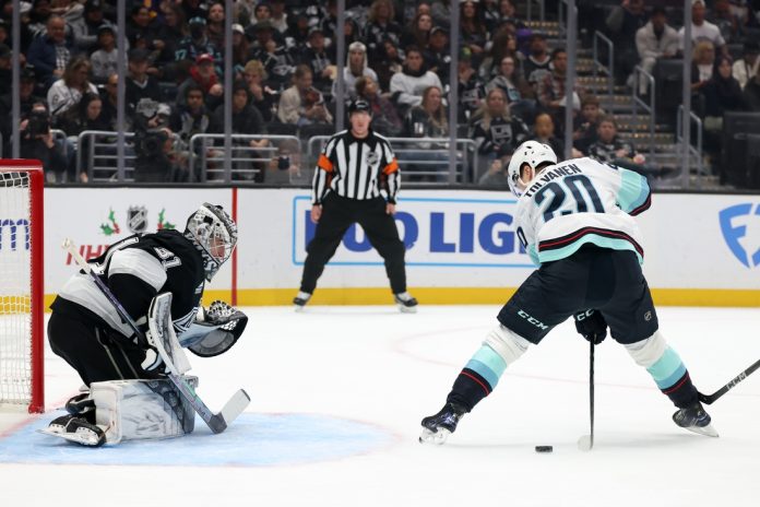 Los Angeles opened the scoring at 4:19 of the second. Alex Turcotte skated the puck around the back of the Seattle net and came back out to the right-wing corner before finding Kempe in the high slot. Kempe deked past one defender and put a wrist shot into the upper left corner of the net.