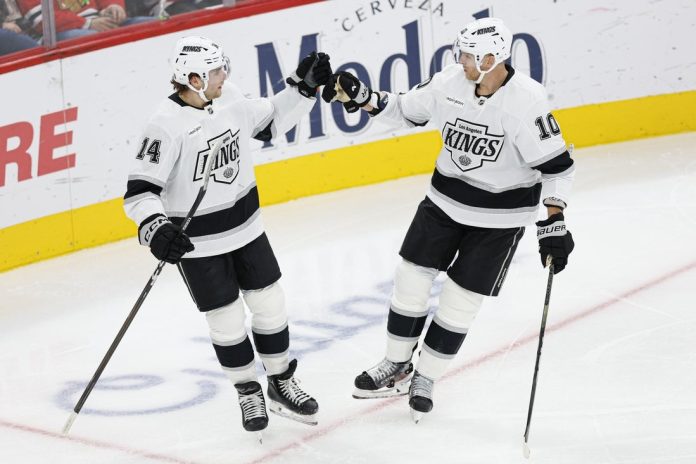 Chicago took a 1-0 lead at 7:04 of the first period after Ilya Mikheyev stole the puck from Kings forward Alex Turcotte along the wall in the neutral zone, leading to an odd-man rush the other way.