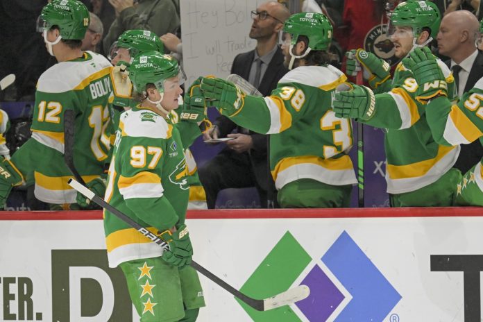 Minnesota opened the scoring on a highlight-reel goal by Kaprizov with 5:42 remaining in the first period. The Wild’s leading scorer stood several feet to the right of the crease and fired a hard-angle wrist shot over Ersson’s left shoulder.