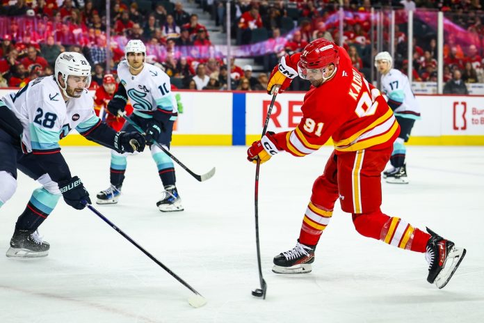 Seattle tied it at 15:19 as Wright forced a turnover just inside Calgary’s blue line and shoveled the puck to Burakovsky, who snuck the puck between Wolf’s pads on a wrist shot from the left faceoff circle.
