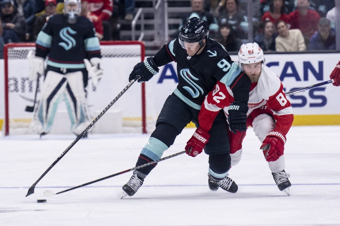 Seattle extended its lead at 19:52 of the second on a four-on-four situation with skaters from both teams in the penalty box. Eberle tracked down a loose puck behind the Detroit net and fed Beniers on the right wing. The rookie quickly made a centering pass to Oleksiak, a defenseman who had joined the rush, and he tipped the puck past Husso.