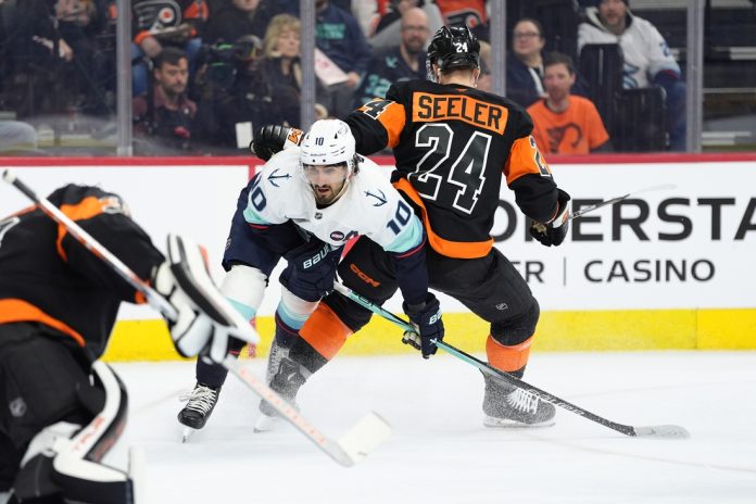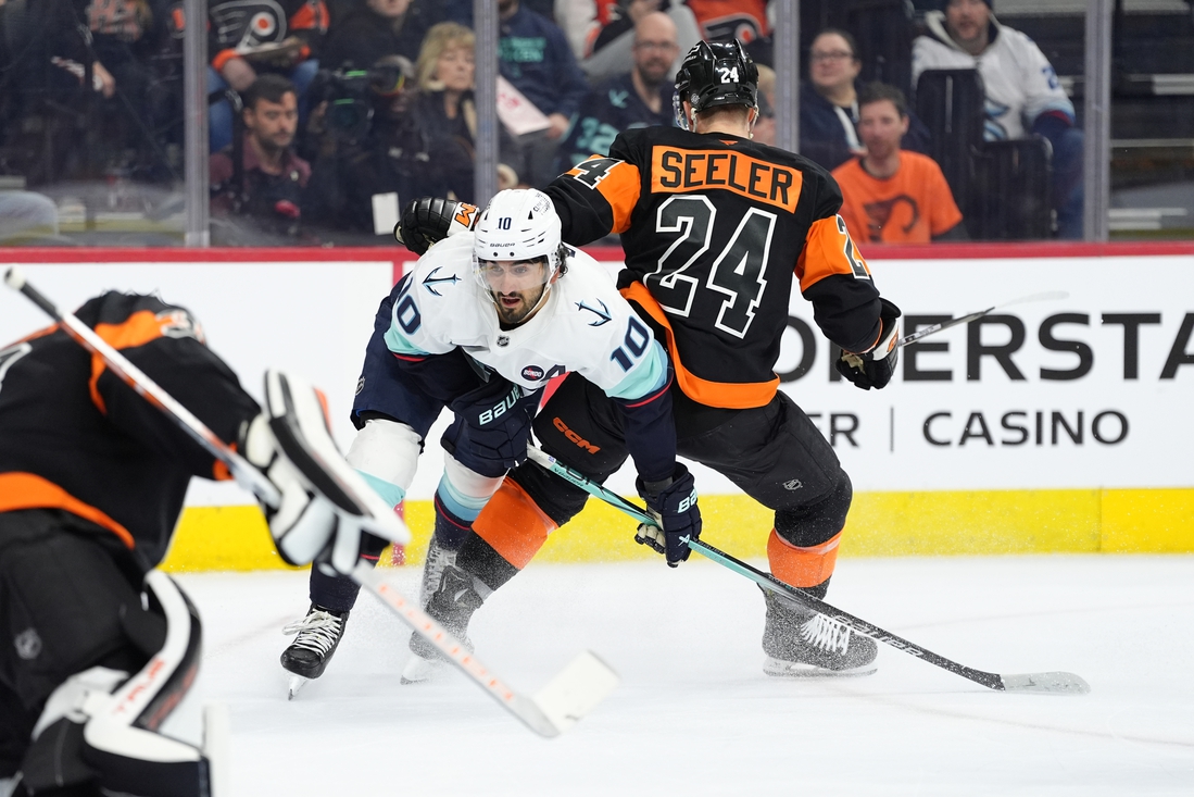 Matty Beniers had a goal and an assist and goaltender Philipp Grubauer made 23 saves for his first victory since Dec. 30 as the Seattle Kraken defeated the host Philadelphia Flyers 4-1 Saturday afternoon.
