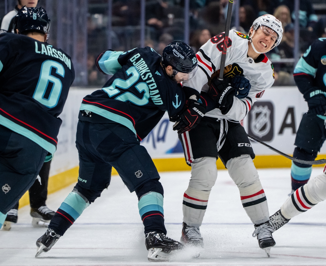 The Blackhawks got on the board at 3:22 of the period as Donato, who played for the Kraken in their first two years of existence, skated over the blue line and took a shot from the top of the left faceoff circle. Daccord made a pad save but couldn’t find the rebound, and Donato tracked down the puck and shot it off the left post and then the back of Daccord’s skate, before it trickled over the goal line.