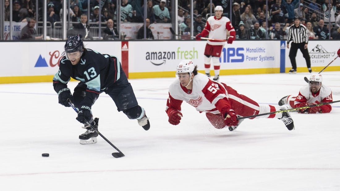 The Kraken put a stop to the Red Wings’ five-game winning streak, breaking a tie with two goals in the second and another early in the third.