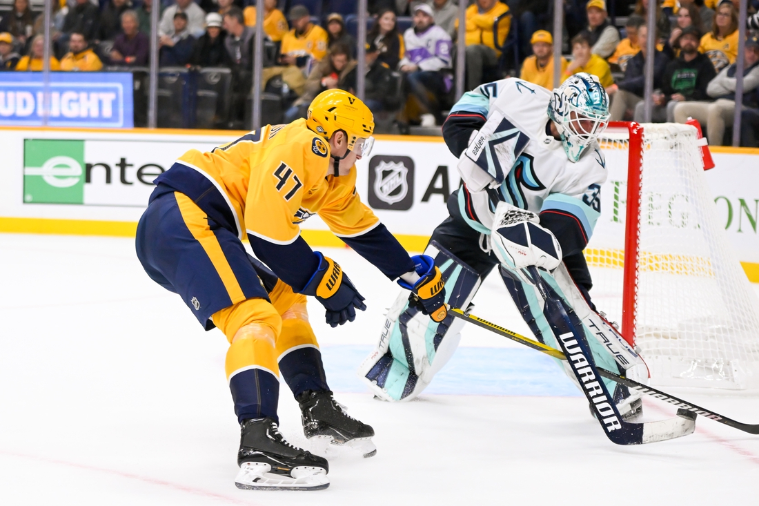 Jaden Schwartz, Oliver Bjorkstrand, Jared McCann and Adam Larsson each had a goal and an assist and the Seattle Kraken scored four third-period goals to defeat the host Nashville Predators 7-3 on Tuesday.
