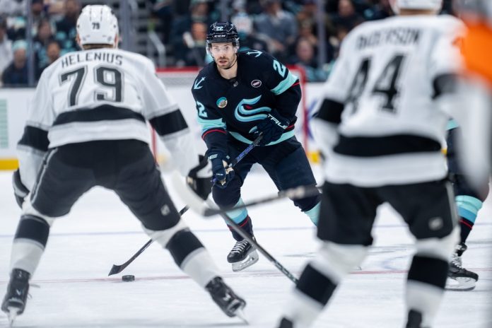 A bone-rattling hit by Kraken defenseman Joshua Mahura on Foegele just after he carried the puck into the offensive zone led to Seattle’s second goal. While Quinton Byfield and Tanner Jeannot jawed at Mahura for the check, the Kraken sped down the ice on a two-on-one rush, with Kakko sending a cross-ice pass to Schwartz for a wrist shot from the bottom of the right faceoff circle that beat Kuemper has he tried to slide across the crease.