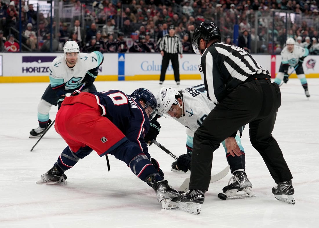 Seattle took the lead just 48 seconds later on a three-on-two rush. Eberle carried the puck out of his own zone and fed McCann on the left wing. McCann’s initial shot was stopped by Merzlikins, but Eberle collected the rebound in the slot and went to his backhand to slide the puck under the sprawling goalie.