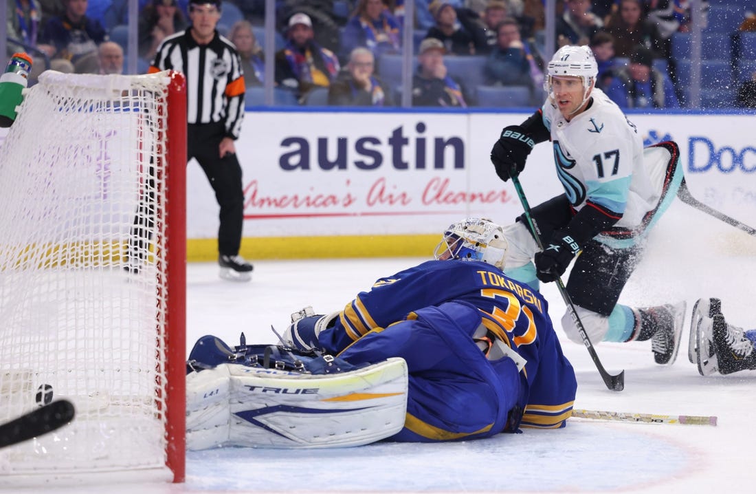 Sprong capitalized on a Buffalo turnover to extend it to 3-0 at 4:46 of the second period. Sabres forward Vinnie Hinostroza’s backhand pass deflected off a Kraken stick and redirected into the slot for Sprong, who got Comrie to bite on a deke before sliding it by his outstretched left leg.