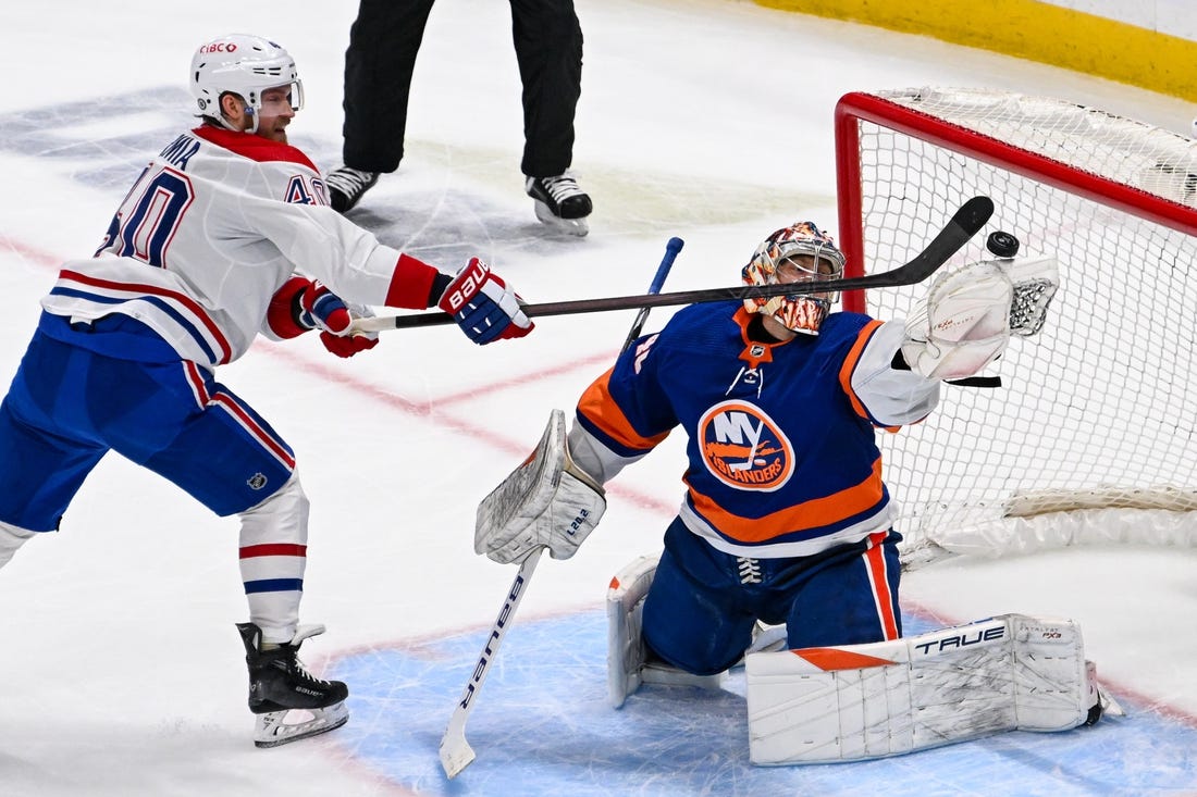 Engvall tied the score 5:17 into the second. Adam Pelech passed to Engvall and he moved into the slot and sent a shot over the glove of Montembeault, who was screened by Islanders center Brock Nelson leaping over sliding Canadiens defenseman Justin Barron.
