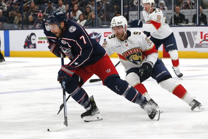 Sam Reinhart scored one goal and had two assists as the Florida Panthers defeated the Blue Jackets 4-3 in an emotional home opener for Columbus on Tuesday night.