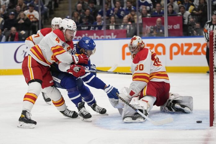 Calgary’s Yegor Sharangovich and Toronto’s Mitchell Marner converted their shootout attempts. In the final round, Domi scored on a wrist shot before Woll stopped Dillon Dube’s backhand attempt.