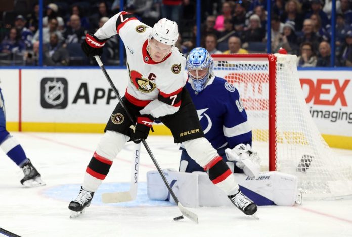 Playing a third game in four nights, Ottawa did not generate a shot on its first power play, but Tampa Bay’s top man-advantage unit put the hosts up 1-0 at 9:23 after Ridly Greig high-sticked Point.