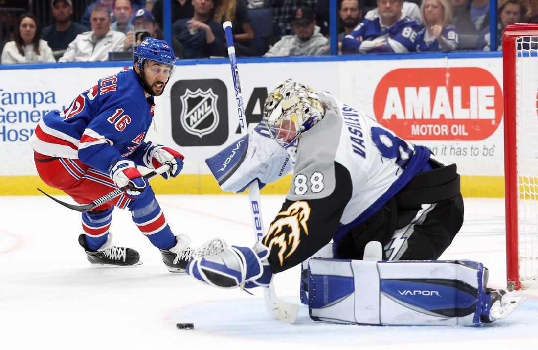 Zibanejad, who scored four goals in three games last season against the Lightning, opened the scoring by taking a pass from Ryan Lindgren and sending it home from the high slot at 12:45. The goal was Zibanejad’s 16th of the season.