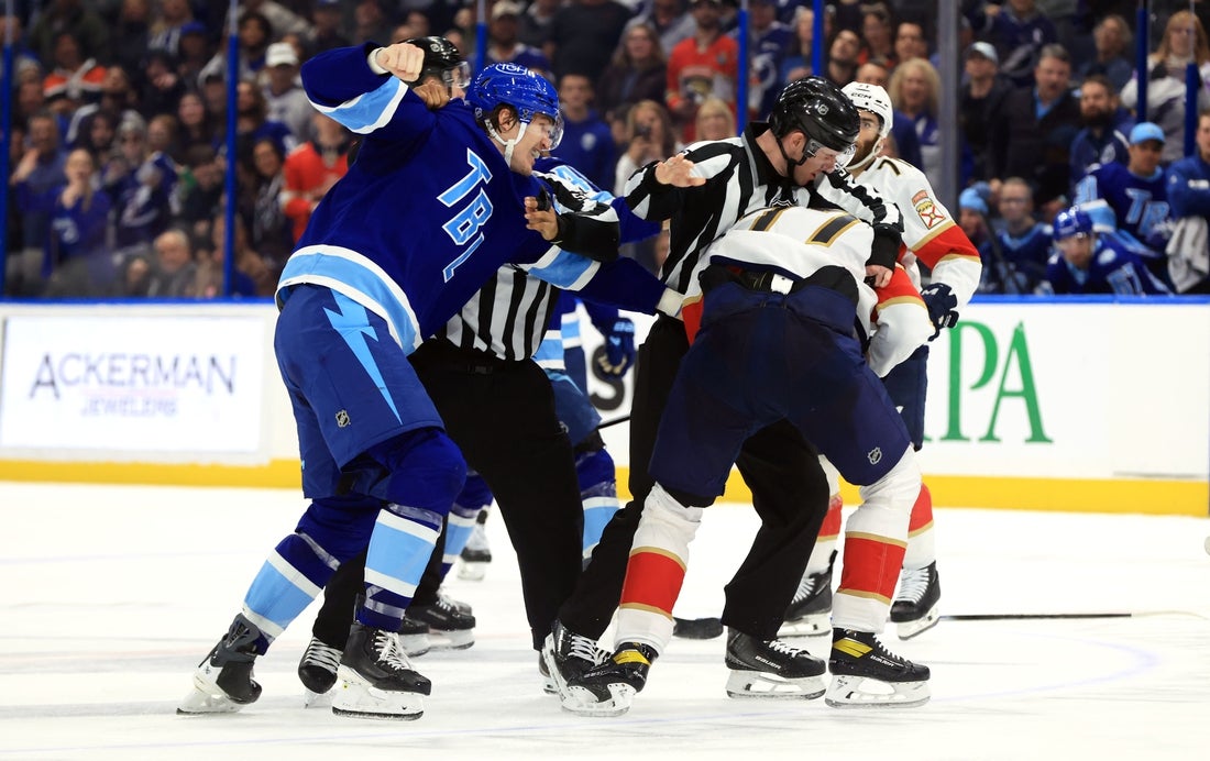 Douglas’ five-minute fighting major and 10-minute misconduct contributed to a whopping game total of 147 penalty minutes. Lightning defenseman J.J. Moser was ejected in the third period along with Panthers defenseman Gustav Forsling and head coach Paul Maurice.
