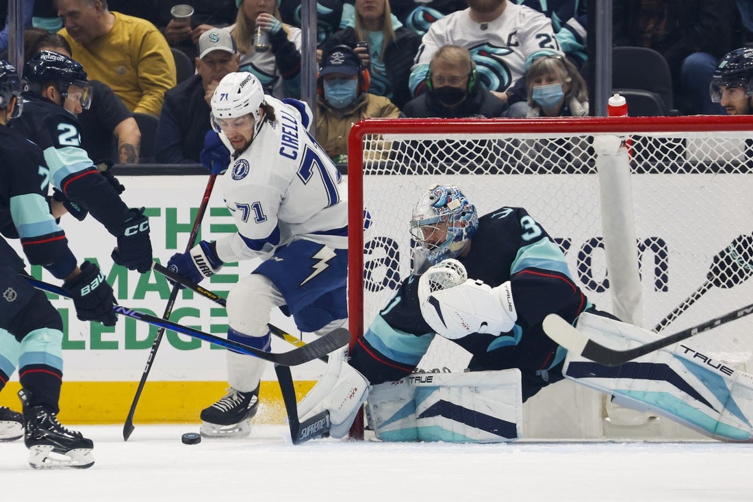 Andrei Vasilevskiy made 22 saves as the Tampa Bay Lightning put an end to Seattle’s franchise-record, eight-game winning streak, defeating the host Kraken 4-1 in a Martin Luther King Jr. Day matinee.