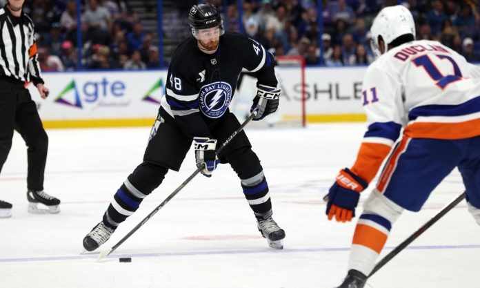 Bjorkstrand opened the scoring 8:46 into the first when Darren Raddysh’s shot from the blue line glanced off the stick of Bjorkstrand and fluttered past Sorokin, who was screened by Bjorkstrand, as well as Lightning center Gage Goncalves and the Islanders’ Noah Dobson and Maxim Tsyplakov.