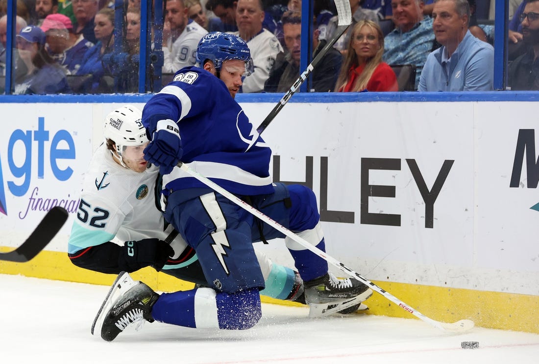 Coach Jon Cooper mixed it up in Monday’s five-minute period, sending out fourth-line center Luke Glendening for the opening faceoff, but the veteran specialist in the circle lost the draw to Seattle’s Pierre-Edouard Bellemare, who played for Cooper last season.
