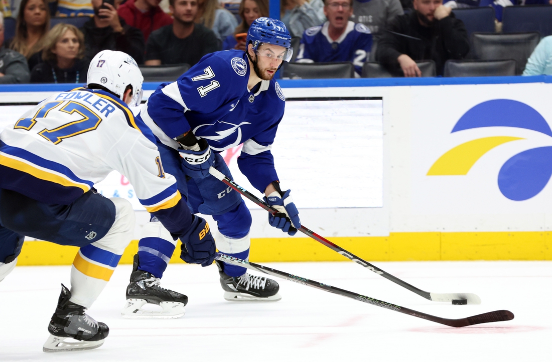 After netting 18 goals in three games, the Lightning’s offense flashed again in the first period when Blues defensemen Tyler Tucker and Scott Perunovich got crossed up while Conor Geekie possessed the puck.