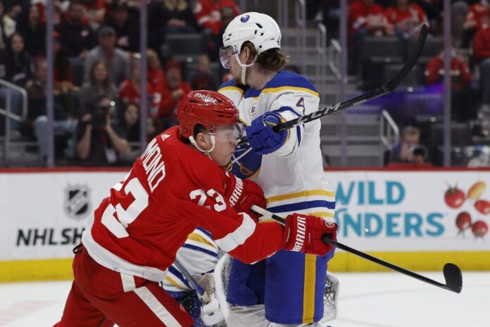 Raymond gave Detroit a 1-0 lead 53 seconds into the first period when he intercepted Buffalo winger Jack Quinn’s pass attempt and carried it up the middle before snapping a shot from above the slot that beat Luukkonen glove side.