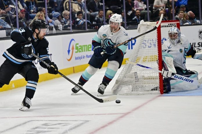 Utah scored twice in the opening five minutes of the second period to take a 3-1 lead. Schmidt tallied 28 seconds into the period as Jack McBain’s centering pass caromed off the side boards and back to Schmidt for a slap shot from the left point that beat a screened Grubauer. Schmaltz scored at 4:31 after Schmidt’s slap shot from the blue line went wide of the net but bounced off the end boards and back out front.