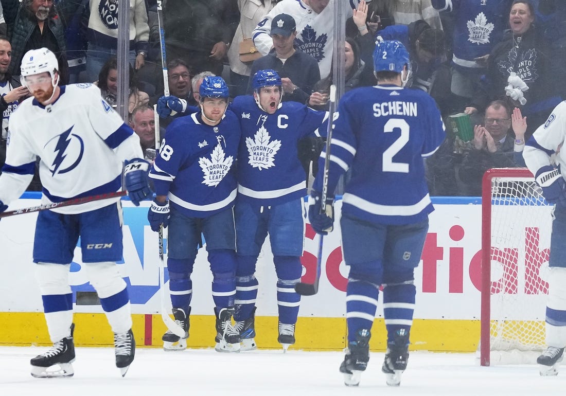 Nylander scored from the left circle on a shot that grazed off Vasilevskiy’s shoulder on the glove side at 15:08 after Rielly’s pass. Toronto had an extra attacker with a delayed penalty being called against Tampa Bay.