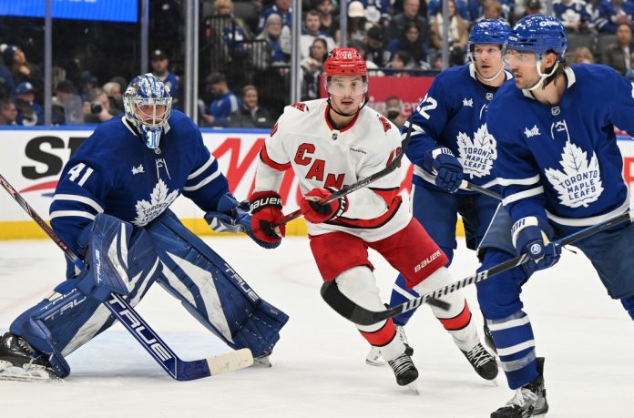 Carolina played with more urgency in the second period. There were few clear scoring chances for either team until Toronto’s Mitchell Marner was foiled on a short-handed breakaway at 16:13.