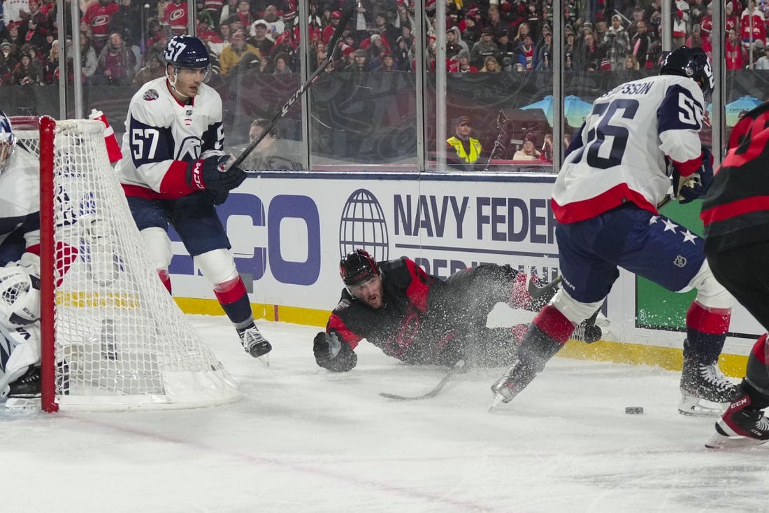 Martin Necas had a goal and two assists as the Carolina Hurricanes beat the Washington Capitals 4-1 in a Stadium Series game in front of 56,961 fans Saturday night in Raleigh, N.C.