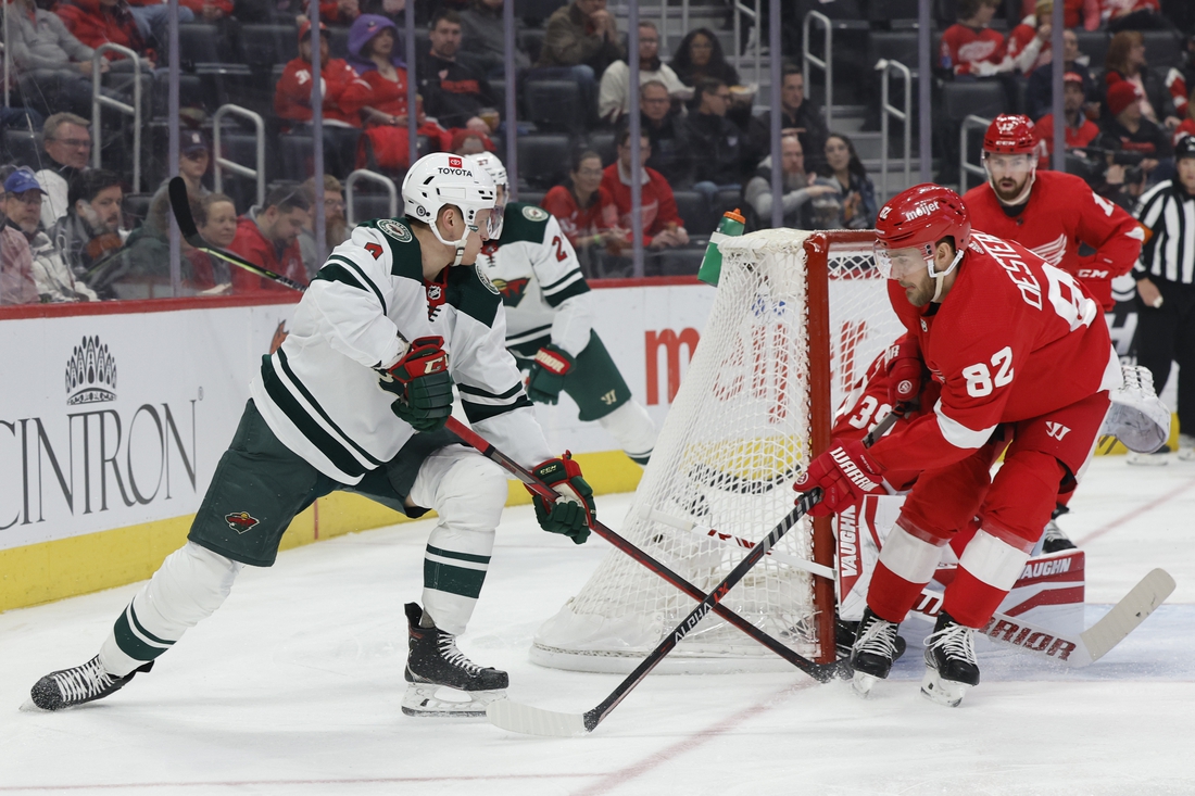Boldy scored 1:37 into the game after the Red Wings gave away the puck in their zone. He one-timed a shot from the left circle past Nedeljkovic off a Fiala feed.