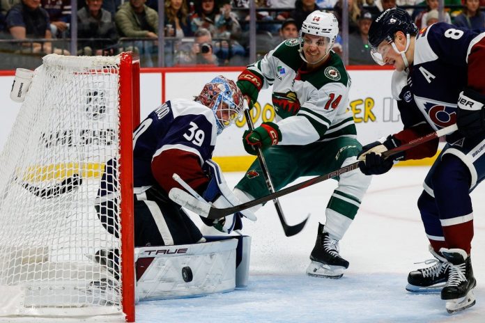 Eriksson Ek’s first goal of the game, at 7:48 of the second period, gave Minnesota a 1-0 edge. The Avalanche answered when MacKinnon left a drop pass for Necas as they skated into the Wild zone, and Necas beat Gustavsson with a wrister at 13:30.