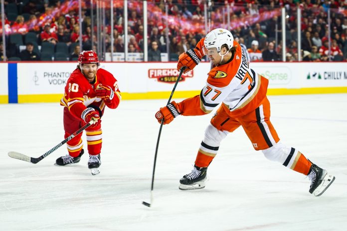Calgary turned the puck over coming across the Anaheim blue line and Vatrano took possession. He carried the puck through the neutral zone and into the left circle before scoring with a wrist shot at 11:54.