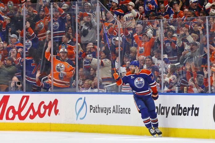 It’s the second straight game a defenseman delivered a hat trick for the Oilers after Evan Bouchard had three goals and three assists in a 6-5 overtime victory against the Washington Capitals on Saturday.
