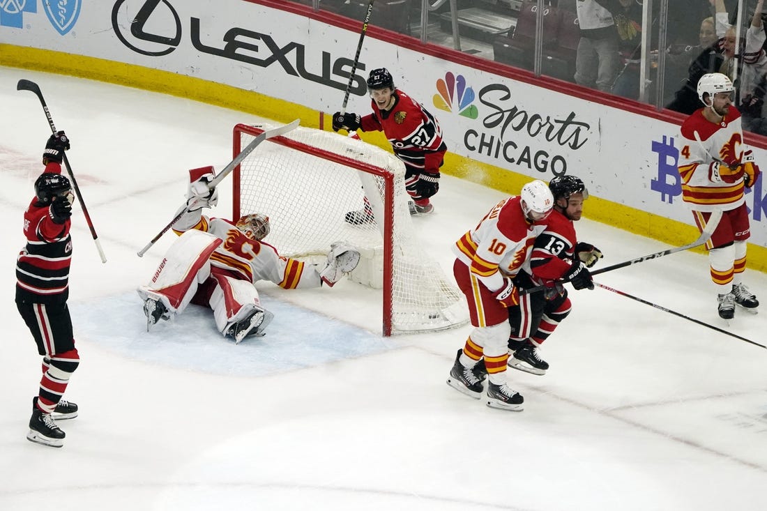Calgary benefited from a rebound of its own to get the equalizer on Elias Lindholm’s power-play goal at 8:49 of the period, but Chicago regained the lead just 1:21 later when Colin Blackwell scored on a rebound as he crashed the net.