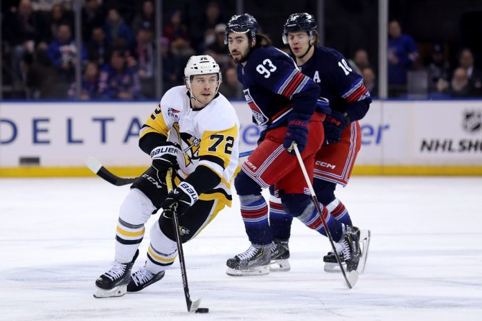 Philip Tomasino’s tiebreaking score highlighted a three-goal second period as the Pittsburgh Penguins, minus superstars Sidney Crosby and Evgeni Malkin, gutted out a 3-2 road win over the New York Rangers on Friday night.