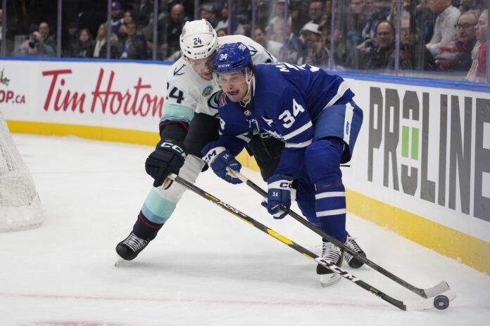 Mitchell Marner scored three goals in regulation and added the decisive goal in a shootout and the Toronto Maple Leafs defeated the visiting Seattle Kraken 4-3 Thursday night.