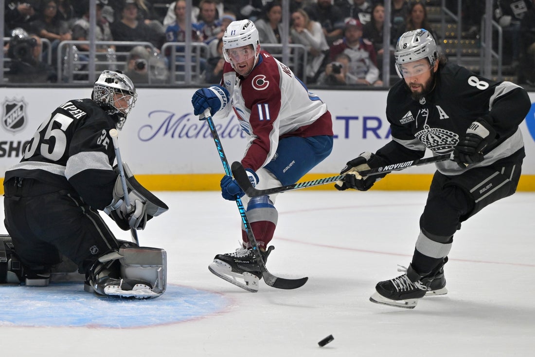 The Kings had just killed the game’s first power play when MacKinnon took the puck behind the Los Angeles net during a delayed slashing penalty and passed it out front to Necas above the right hashmarks. Necas skated into the right circle and scored with a wrist shot for a 1-0 lead 48 seconds into the middle frame.