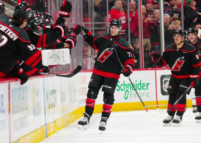 He followed an 11-game stretch without a goal by scoring Tuesday night at Boston. After one more game, he became a member of the Hurricanes.