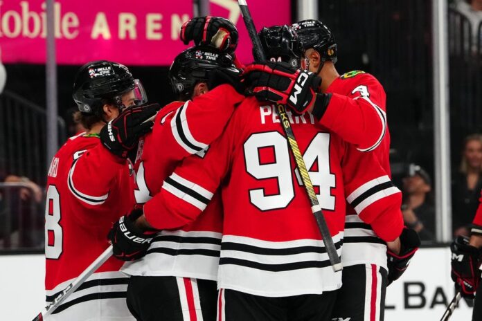 Philipp Kurashev scored with 2:10 left in overtime as the Chicago Blackhawks snapped the Vegas Golden Knights’ seven-game winning streak to open the season, a franchise record, with a 4-3 victory Friday in Las Vegas.