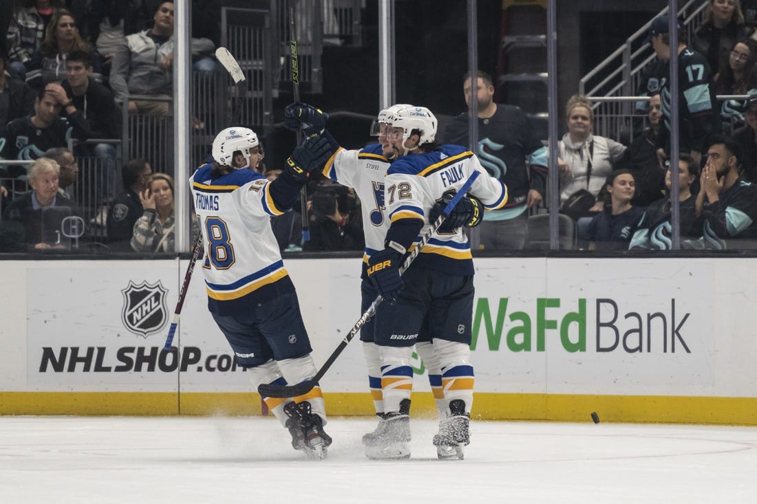 Justin Faulk scored twice, including the winner 2:10 into overtime, as the St. Louis Blues defeated the host Seattle Kraken 4-3 on Wednesday night.