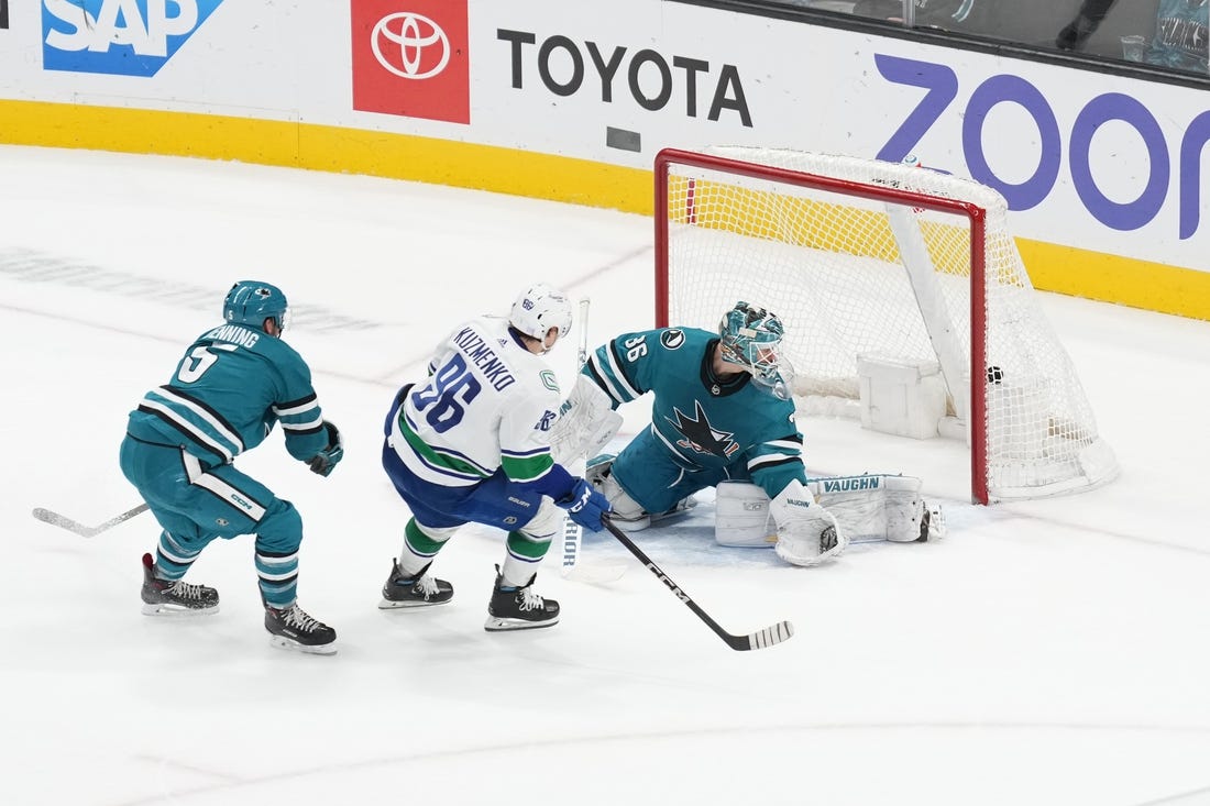 With San Jose in the midst of a line change, J.T. Miller fired a stretch pass to a wide-open Kuzmenko, who went in and fired a wrist shot past Kaapo Kahkonen’s glove side for the game-winner.