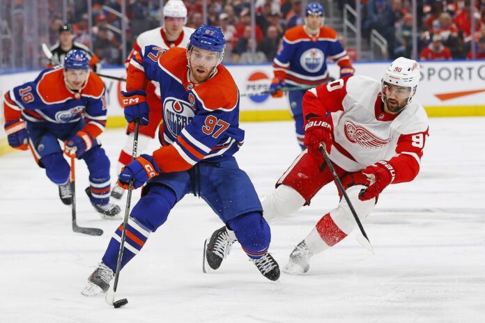 Connor McDavid dished out a career-high six assists and Ryan Nugent-Hopkins had two goals and a helper as the Edmonton Oilers downed the visiting Detroit Red Wings 8-4 on Tuesday night.