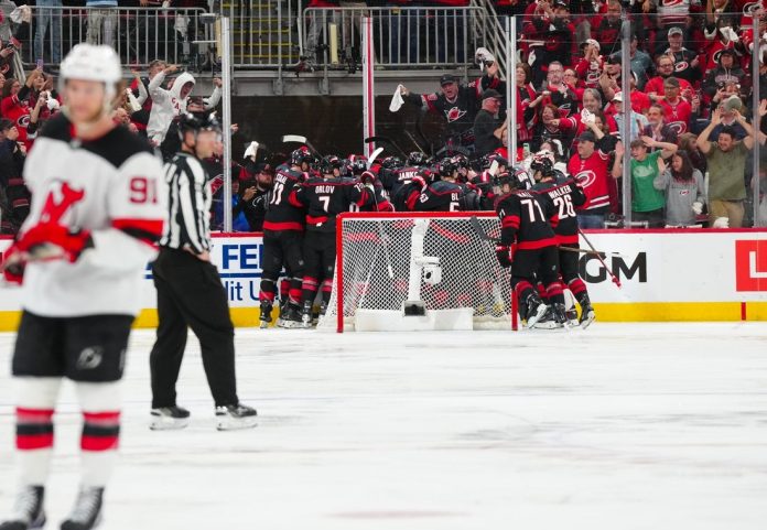 With less than a minute remaining on a high-sticking double minor to New Jersey’s Dawson Mercer, Aho beat goalie Jacob Markstrom with a one-timer from the right circle.