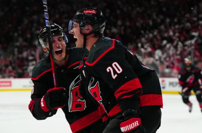 With goalie Frederik Andersen pulled for the extra attacker, Aho tipped in Andrei Svechnikov’s shot to tie the game 3-3 with 2:15 to go. Martinook got the winner with 2:06 left when he jammed in a loose puck from the side of the net. Jake Guentzel added an empty-net goal with 56 seconds remaining.