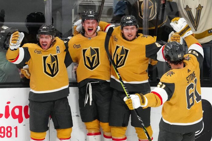 Jonathan Marchessault tallied twice for the Golden Knights, including the tying goal with 16.3 seconds left in regulation and the goalie pulled for an extra attacker.