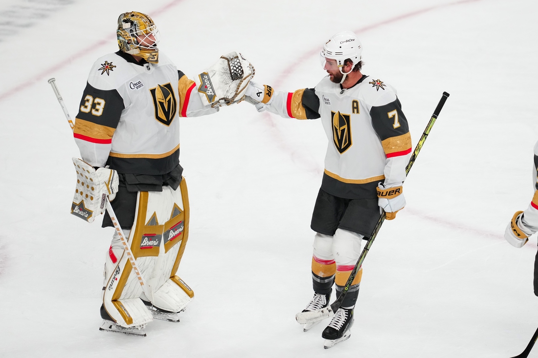 Hertl tied the score at 4-4 on the power play when he slid a feed from Mark Stone through the legs of Ullmark with 3:11 left. Kolesar scored one minute later to give Vegas the lead, before Barbashev tacked on an empty-netter for his second goal of the game and seventh of the season.