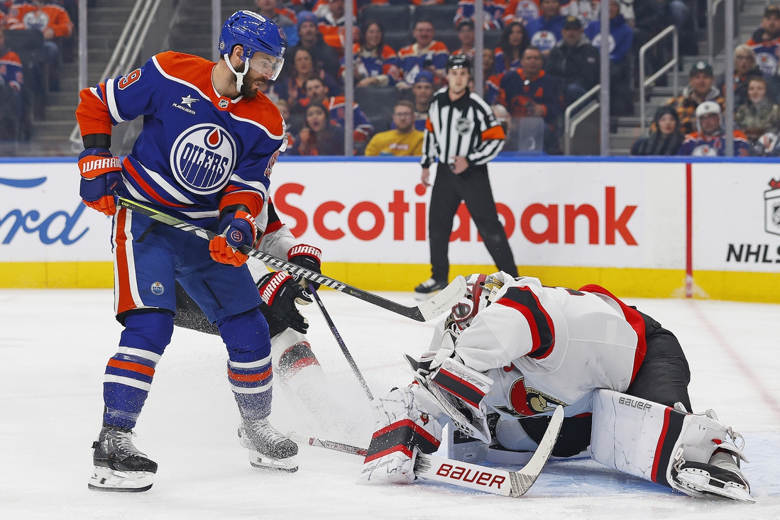 Zach Hyman extended his goal streak to six games and Stuart Skinner made 20 saves as the Edmonton Oilers moved into second place in the Pacific Division with a 3-1 victory over the visiting Ottawa Senators on Sunday night.
