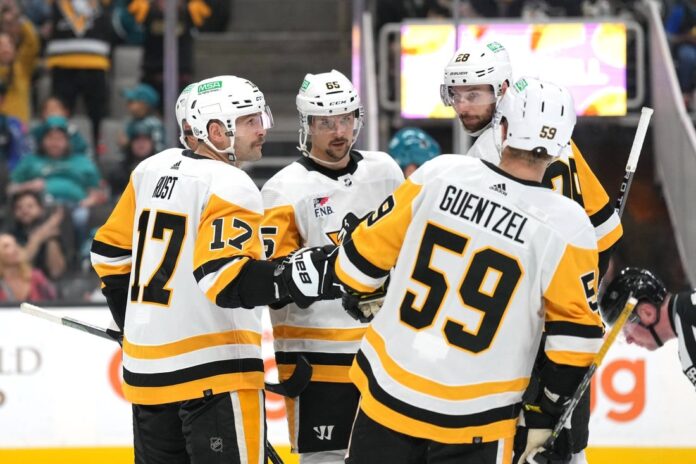 Erik Karlsson recorded two assists in his first game back in San Jose after being traded to the Penguins over the summer, and Sidney Crosby collected one helper in his 1,200th regular-season game. Goaltender Tristan Jarry made 24 saves.